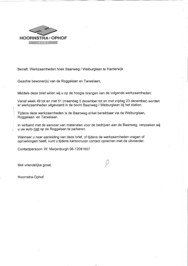 Afgelopen donderdagavond bezorgde de aannemer Hoornstra-Ophof een briefje in de brievenbus. Met daarin de aankondiging dat er na het weekend werkzaamheden starten en de vraag om auto’s niet te parkeren op de Roggelaan. Zodoende aanvoer van materialen voor bedrijven aan de Baanweg mogelijk blijkt. Dan verwacht je geen –Stopverbod- en hekken met grote 30 km/u borden die de weg voor de helft blokkeren.